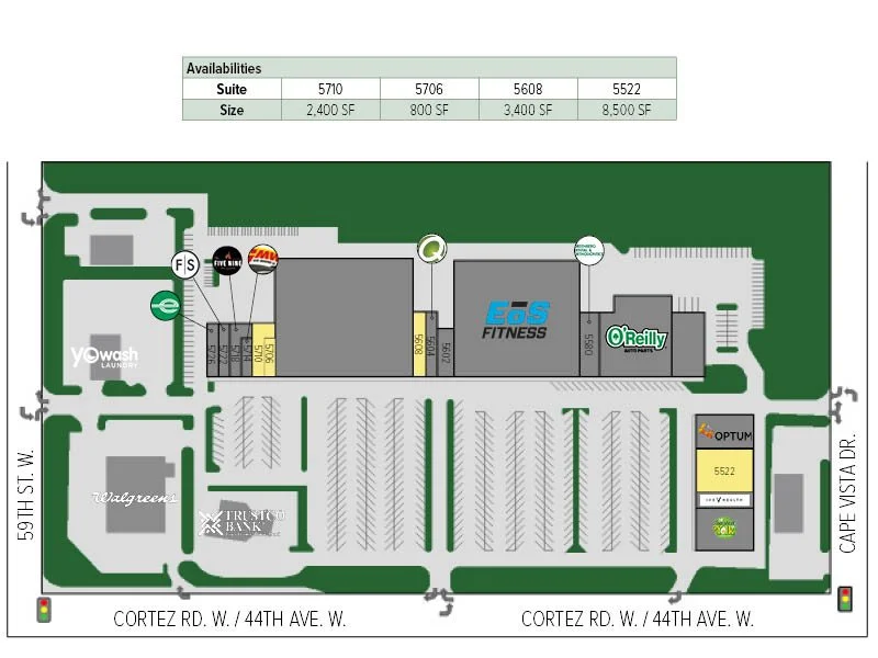 Come join EoS Fitness (2026 opening) at Cortez Commons, conveniently located on Cortez Road W and directly across from Super Walmart's #2 store in FL. This fully refurbished 143,000 sf shopping center has excellent ingress and egress from three roads (Cortez, 59th, Cape Vista), which together represent traffic counts of 48,000 cars per day. Cortez Commons is anchored by EoS and a mix of national and regional tenants. Surrounded by a mature housing density, the area is poised for significant growth with 10,000 homes entitled within 2 miles (SeaFlower, Aqua by the Bay). Suites available from 800-6,400 sf.